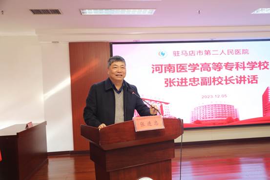 张进忠首先对教学医院签约表示祝贺,对驻马店市第二人民医院长期以来对学校实习工作的支持表示感谢。并介绍了学校的建设发展历程和近年来在教育教学改革中取得的突出成绩,简要解读了职教改革的有关政策和开展校企合作、产教融合的重要意义。他指出,职业教育作为一种类型教育,校企合作、产教融合是其办学模式,“校”“院”合作是高水平培养医药卫生人才的重要保证,是推动医学教育创新发展的重要举措。教学医院签约挂牌,将开启我们“医、教、研”合作的新局面,学校将向医院的全体专业技术人员,开放图书馆、学报、科研实验中心、教科研项目申报等教科研资源,共同推动校、院发展。驻马店市第二人民医院,作为国家精神心理疾病临床医学研究中心豫南分中心,学科体系完善,专业特色突出,临床综合支撑力强,我们的合作,也一定能为心理咨询专业的建设和发展提供更强的保障,培养更多优秀的医学人才,共同为推动医疗卫生事业的发展贡献力量。