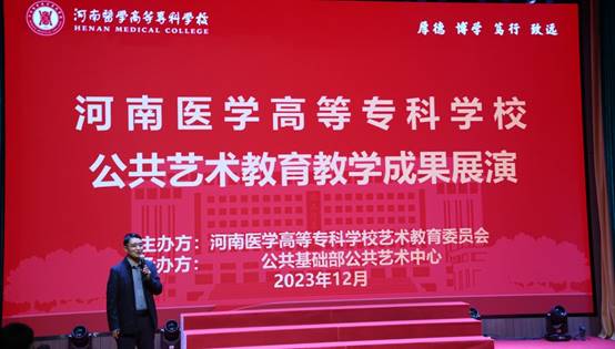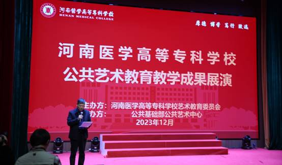 张进忠在致辞中首先对活动的成功举办表示热烈祝贺,对为展演辛勤付出的教职工和学生表示感谢。他指出,近年来,学校高度重视艺术教育工作,着力打造课程建设、实践活动、校园文化、艺术展演“四位一体”的美育教育机制,不断加大投入,充实队伍,教学成果不断涌现,尤其是在全省第六轮公共艺术教育评估工作中,取得了同批次一类院校的好成绩。多所兄弟院校来校进行学习交流,学校美誉度进一步提升。他希望公共基础部艺术中心着力践行立德树人根本任务,以美美与共为指引,以课堂教学为阵地,以艺术实践为抓手,构建符合艺术教育教学规律的“三课堂,两同步”教学模式,深化公共艺术课程改革和教学成果建设。
