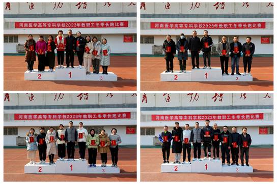 经过激烈角逐,第二分工会王雷和第三分工会郭大海、第四分工会张继娜和第二分工会齐佳分别以男女甲乙组第一名冲过终点线,分获男子甲乙组、女子甲乙组冠军。赛后,校领导们为获奖选手颁发荣誉证书并合影留念。
