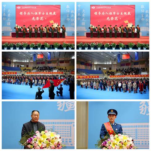 校领导与部队领导为2021级入伍军士生代表佩戴光荣花。2021级入伍军士生家长代表金伟、2021级入伍军士生代表赵弘历辰发言。2021级军士生面对国旗庄严宣誓。听党指挥、牢记使命、保持作风、坚守初心等铮铮誓言展现了2021级军士生即将入伍、献身国防的坚定信念。文艺汇演上,节目精彩纷呈,为2021级入伍军士生送上了饱含深情的祝福。