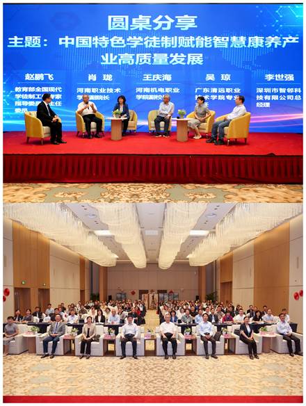 成立仪式后,赵鹏飞作《中国特色学徒制的实践与思考》主旨报告;随后,赵鹏飞、吴琼与河南职业技术学院副校长肖珑、河南机电职业学院副校长王庆海、深圳市智邻科技有限公司总经理李世强以“中国特色学徒制赋能智慧康养产业高质量发展”为题进行了圆桌分享。