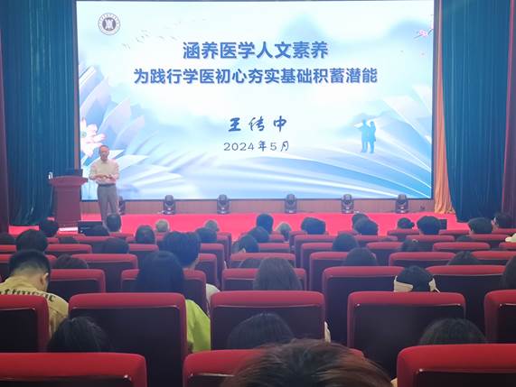 5月9日下午,校党委副书记、关工委主任王传中以《涵养医学人文素养--为践行学医初心夯实基础积蓄潜能》为主题,在公共艺术中心作专题讲座。校团委书记、临床医学院党总支负责人牛槽旺、离退休职工党总支副书记张宇明、离退休职工工作处副处长赵利萍、“五老”职工代表,以及2022级、2023级卓越医生班同学聆听了讲座。