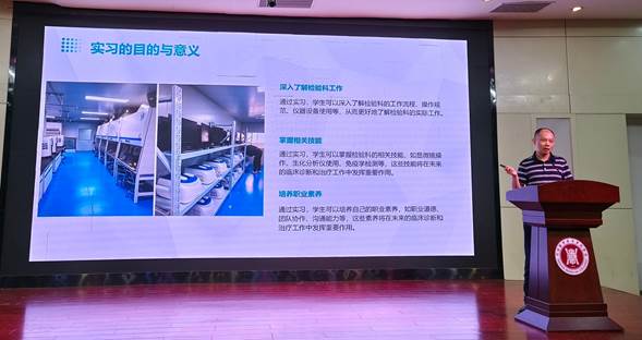 赵亚军从实习目的和预期效果、实习前的准备、实习期间的注意事项、实验室生物安全相关要求、职业暴露处置和检验科常见项目六个模块为即将奔赴实习岗位的实习生进行岗前培训,要求实习生要善于沟通、勤于思考,脚踏实地完成实习内容,并引导实习生做好合理的时间管理和规划,积极备战专升本考试。