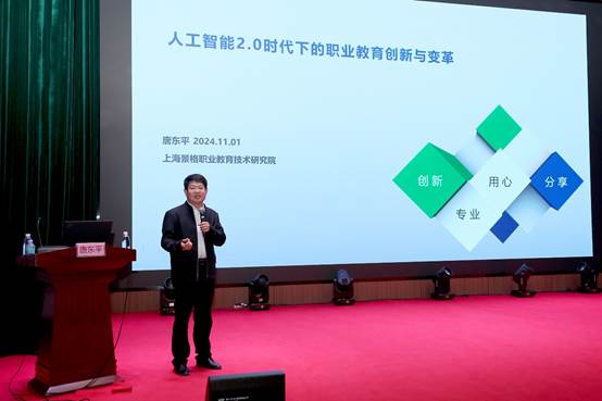讲座围绕“从工业革命视角看新一代人工智能技术”“AI时代每个超级个体都有一个智能团队”“AIGC为专业领域带来的机遇与挑战”“数字员工的出现赋予职业技能教育的新使命”“第四次工业革命浪潮对职业教育的影响”等五个方面展开。唐东平在人工智能时代及第四次工业革命的背景下,对职业教育技术的创新与变革进行了深入讲解,介绍了相关信息化教学技术和方法,展示了职业教育在人工智能浪潮中的无限可能;通过具体案例展示了AI 2.0时代人工智能技术在创意、教育、医疗健康等领域的实际应用,强调了这一技术在提升工作效率与创新能力方面的潜力;分享了人工智能在教材编写和教育教学过程中的问题及解决方案,并提出通过人工智能辅助教学,提高教学效率和学习效果的新模式。