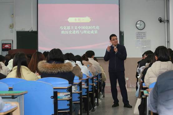 课堂上,李鹏涛首先介绍了马克思主义的诞生与发展,马克思主义传入中国并被中国人民接受的历史过程,强调马克思主义是指导我们认识世界、把握规律、追求真理、改造世界的强大思想武器,马克思主义不仅改变了世界,也深刻改变了中国。马克思主义只有中国化时代化才能解决中国的实际问题,才能不断发展自身,始终保持蓬勃生机和旺盛活力。随后,李鹏涛详细讲解了马克思主义中国化时代化的历程,在新民主主义革命、社会主义革命和建设时期创立的毛泽东思想,是马克思主义中国化时代化的第一次历史性飞跃。改革开放以来我们党在实践中相继形成的邓小平理论、“三个代表”重要思想以及科学发展观等重大战略思想是中国特色社会主义理论体系的重要组成部分,标志着中国特色社会主义理论和实践的进一步成熟。党的十八大以来,创立了习近平新时代中国特色社会主义思想,谱写了中国特色社会主义理论体系的新篇章,习近平新时代中国特色社会主义思想是当代中国马克思主义、二十一世纪马克思主义,是中华文化和中国精神的时代精华,实现了马克思主义中国化时代化新的飞跃。李鹏涛在讲授中指出,马克思主义中国化时代化是一个不断与时俱进的过程,每一次理论创新都以中国特色、中国风格、中国气派科学回答了中国之问、世界之问、人民之问、时代之问。马克思主义只有中国化时代化才能在中国大地上闪耀真理光芒,也只有实现中国化时代化才能救中国、发展中国,才能实现中华民族伟大复兴。