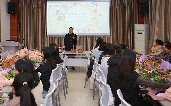 她绽放·花漾师心:3月4日中午,“她绽放・花漾师心”疗愈花艺创作活动在图文信息中心八楼第三会议室举办。党委副书记、工会主席李鹏涛出席活动并讲话。河南省优秀学术技术带头人、省劳模工匠创新工作室成员、省教学技能竞赛获奖教师以及各部门女教职工代表参加。