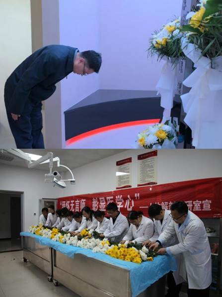 仪式结束后,师生代表依次向“无言良师”纪念碑敬献鲜花。其余学生走进人体解剖学第4实验室,向“大体老师”献上菊花并鞠躬致礼。一朵朵鲜花寄托着哀思,更承载着对医学精神的传承之志。参与学生表示:“亲手触摸生命的奥秘,更深刻体会到‘大体老师’用身躯托起医学未来的意义。我们定不负所托,成为有温度、有担当的医者。”